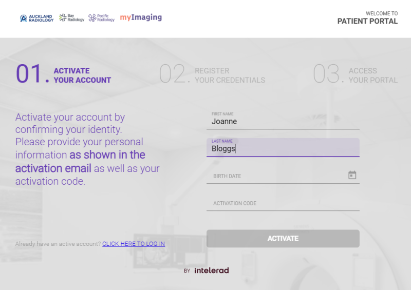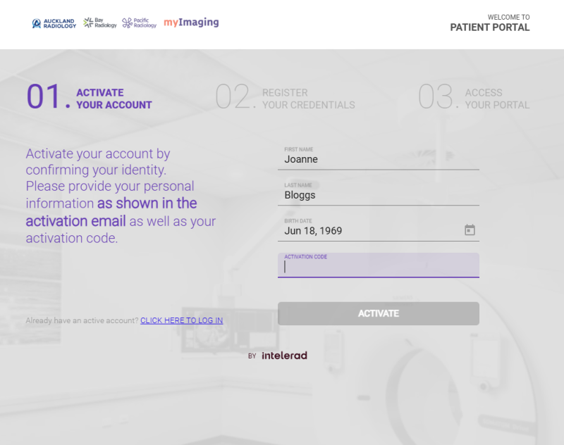 Note: Your activation code will expire after one month. To request a new activation code or for assistance with your activation, email portal@bayradiology.co.nz.